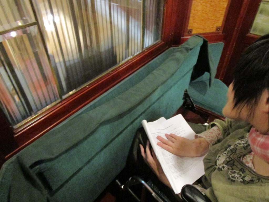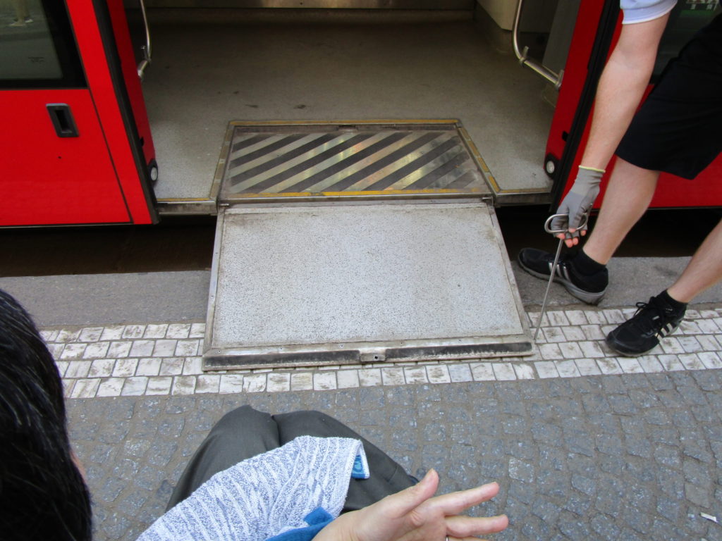 車いすスペースはあるが、固定ベルトがないので注意。しっかりブレーキして手すりを掴む。(日本でも気軽にバスに乗りたい。)