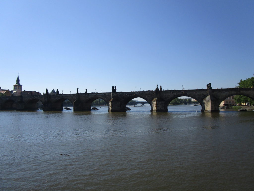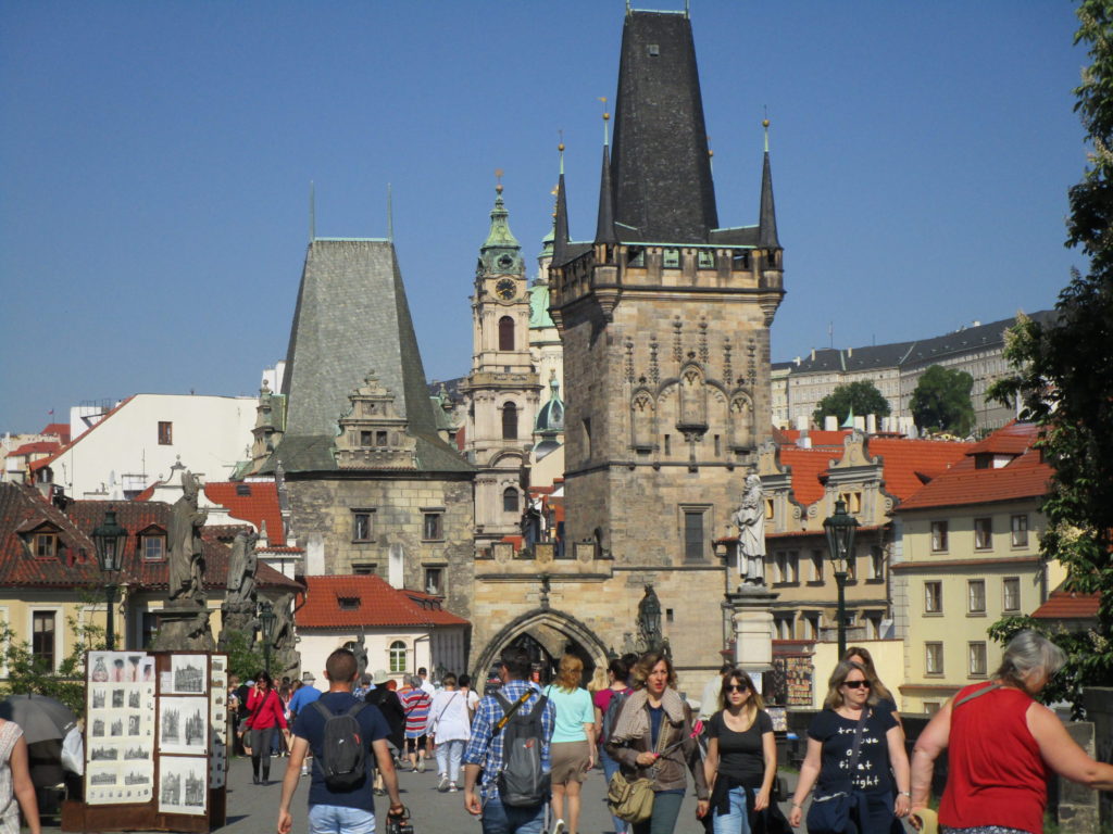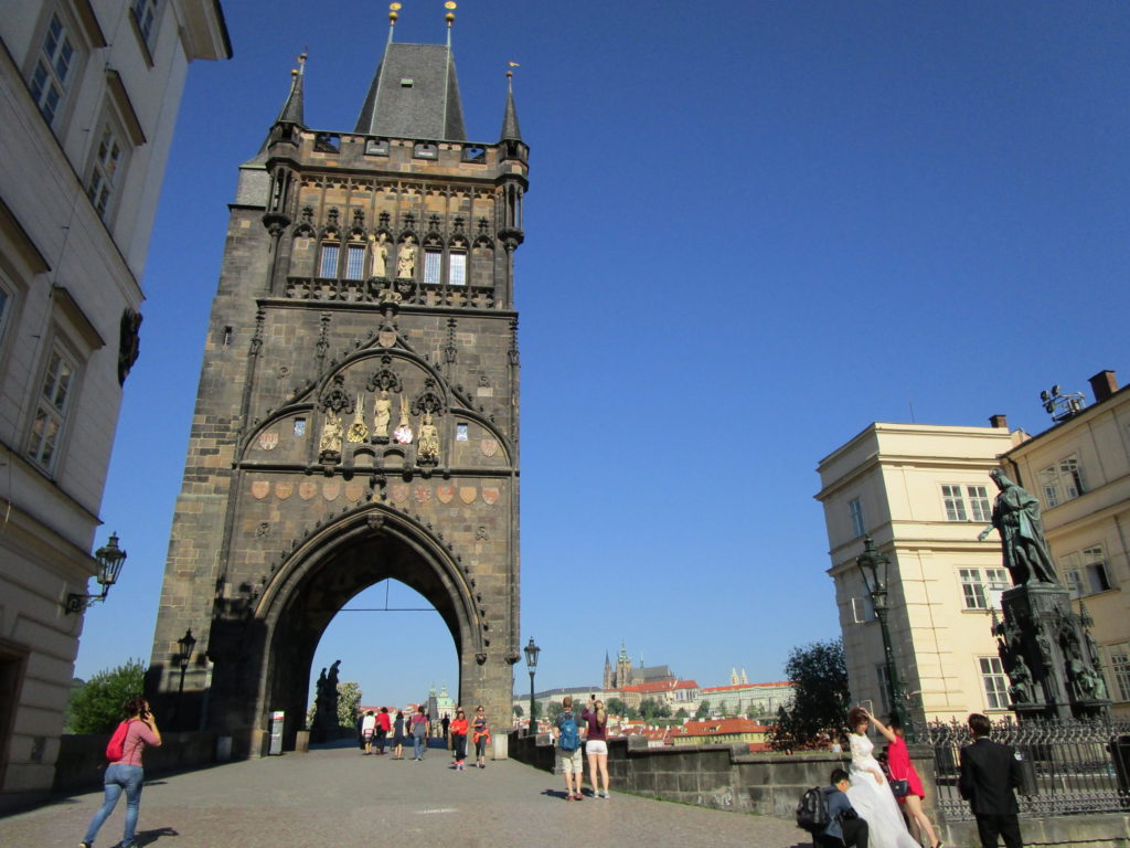 観光名所「カレル橋」へ。その向こうにはプラハ城が見えてくる。