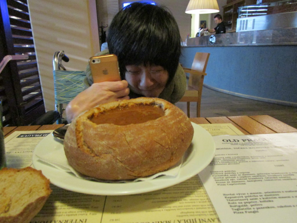 「グラーシュ・スープ・イン・ブレッド」。牛肉シチューのようなものがパンの中に。大きい。