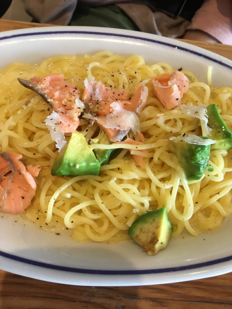 お店でランチ。サーモンとアボカドのクリームパスタを注文。