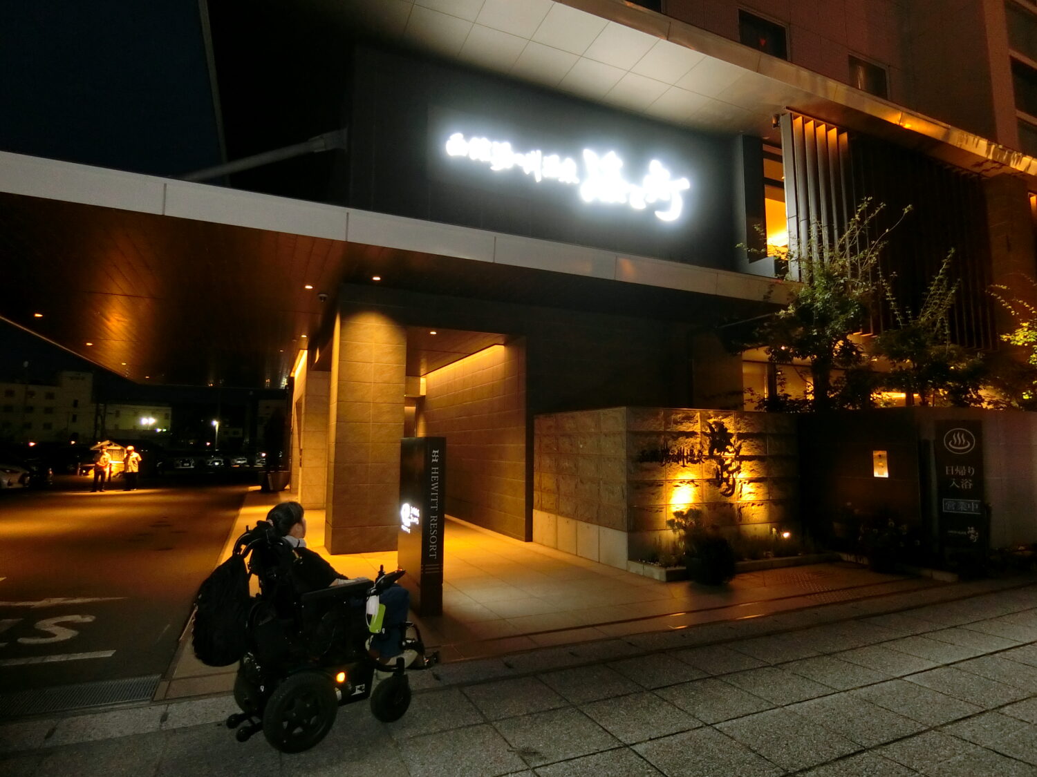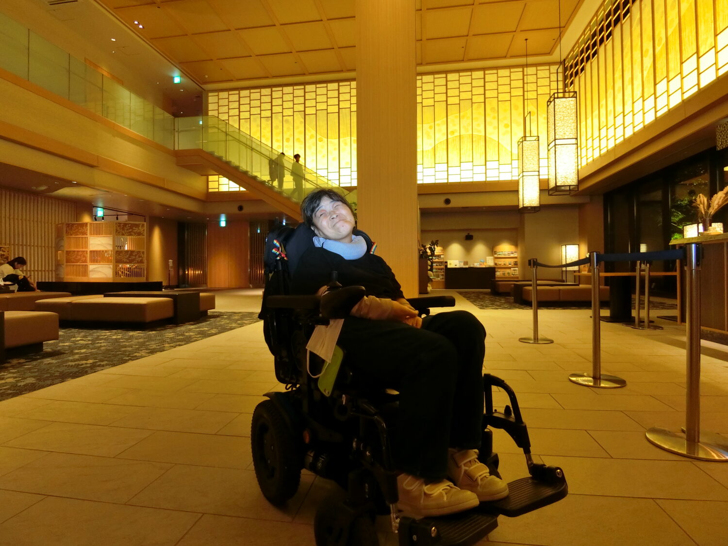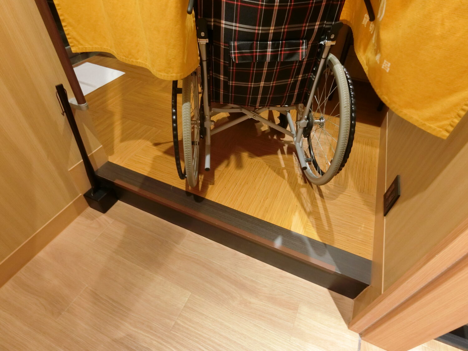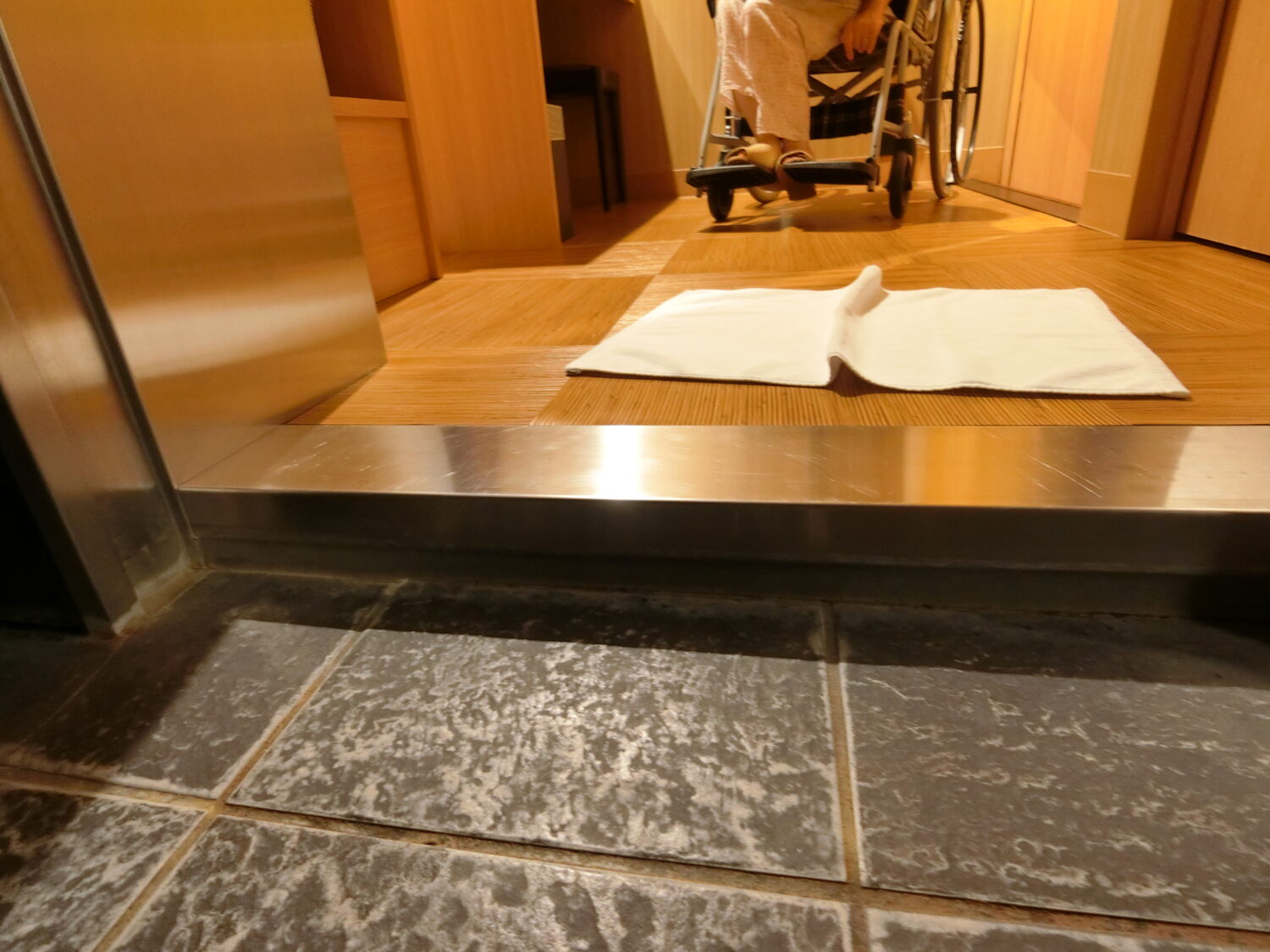お宿の手動車いすをお借りして段差をクリアしました。