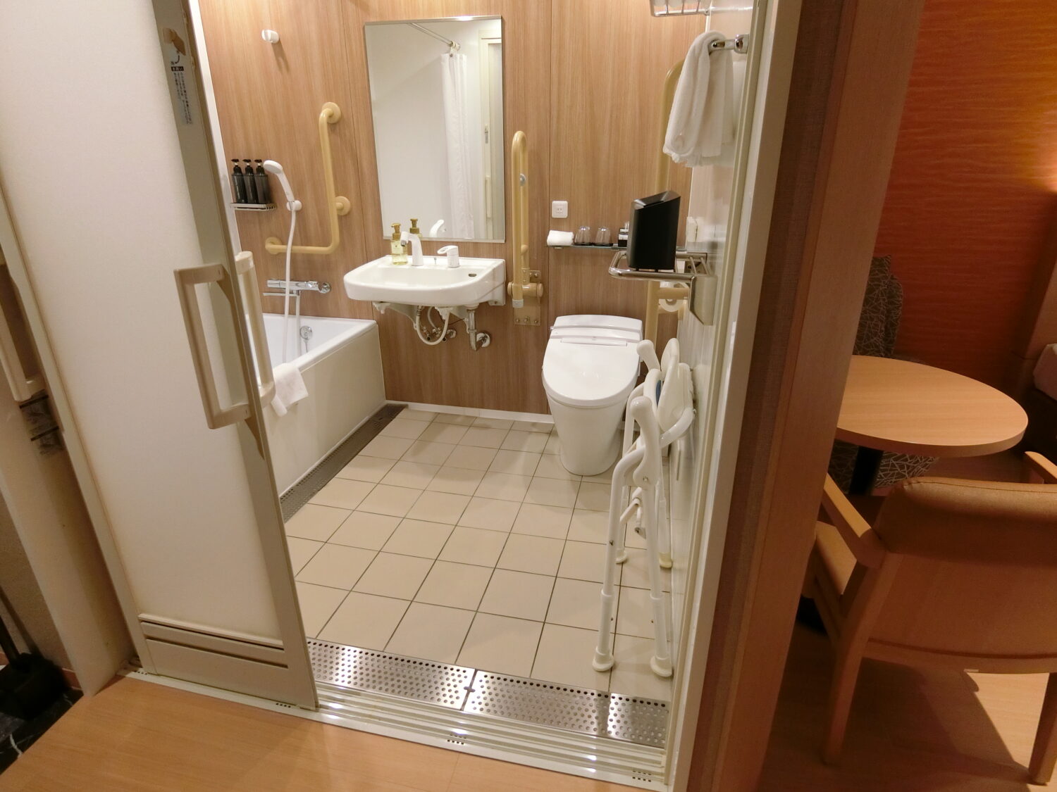 洗面台は入りやすかったです。ただトイレに電動車いすで入ると回転が難しい…。ドアが自分では閉められないかも(^^;)