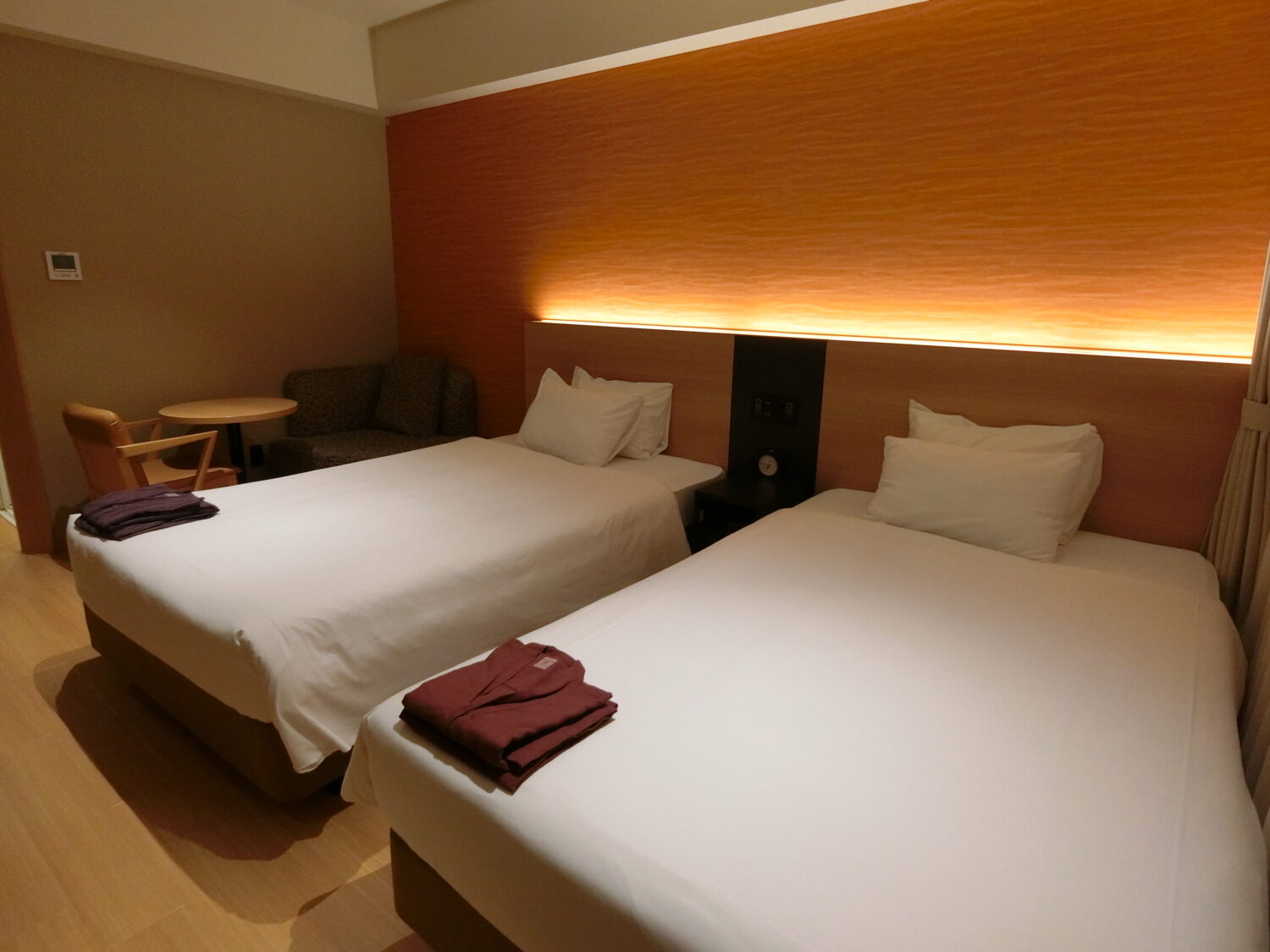 ベッドは大きめのサイズですね。アメニティの作務衣もあります。