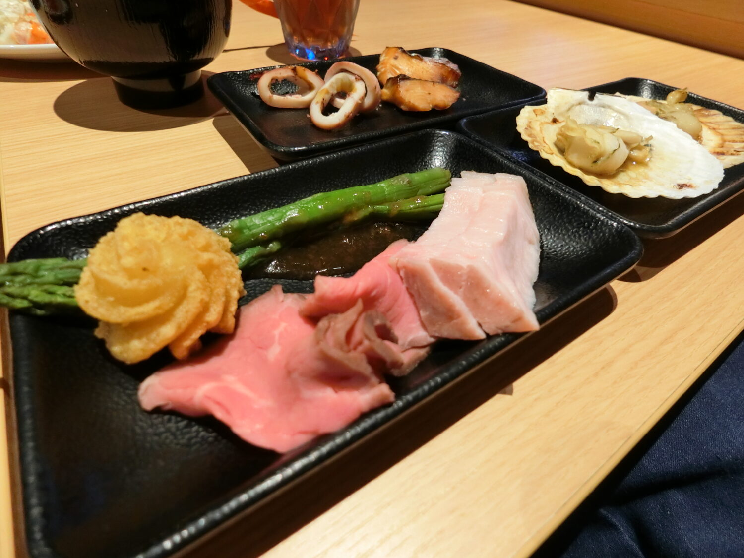 えび天とマグロ、ホタテの刺身など。